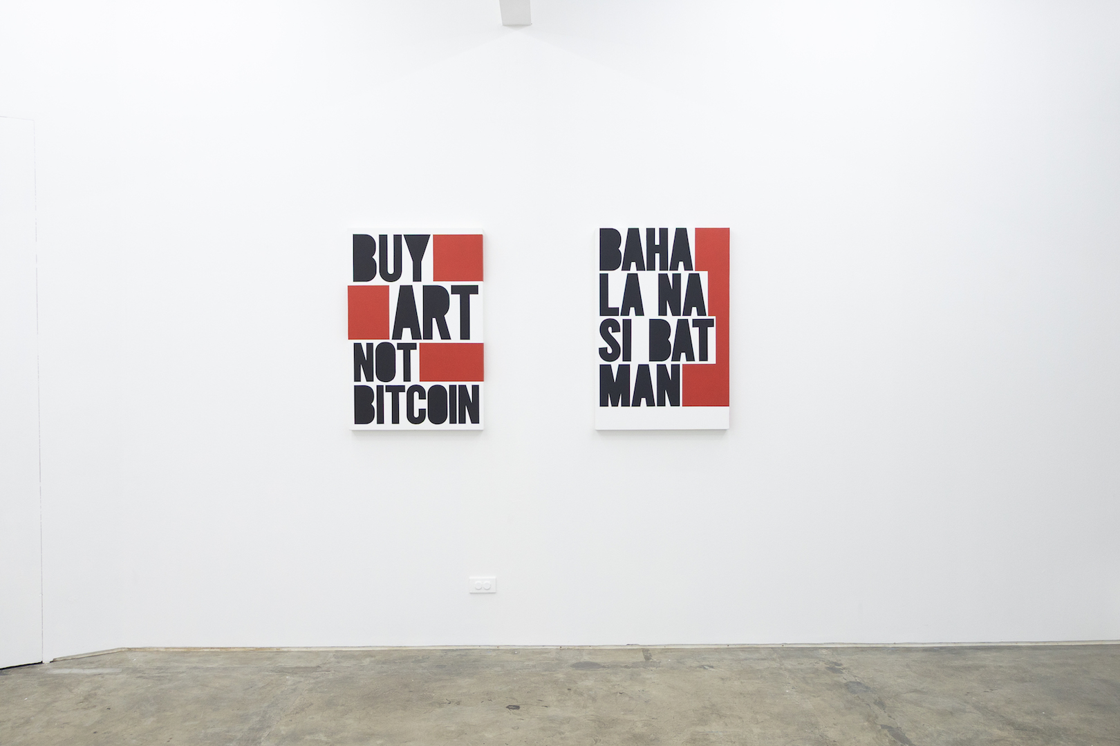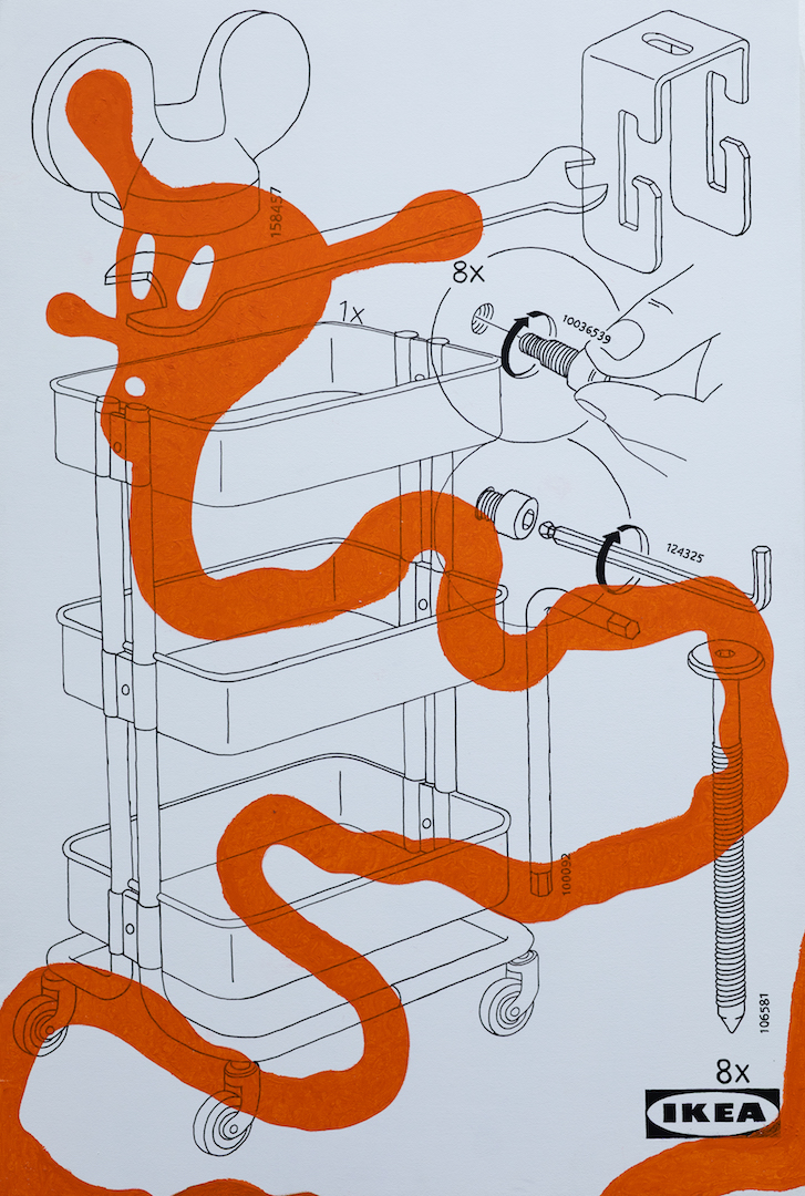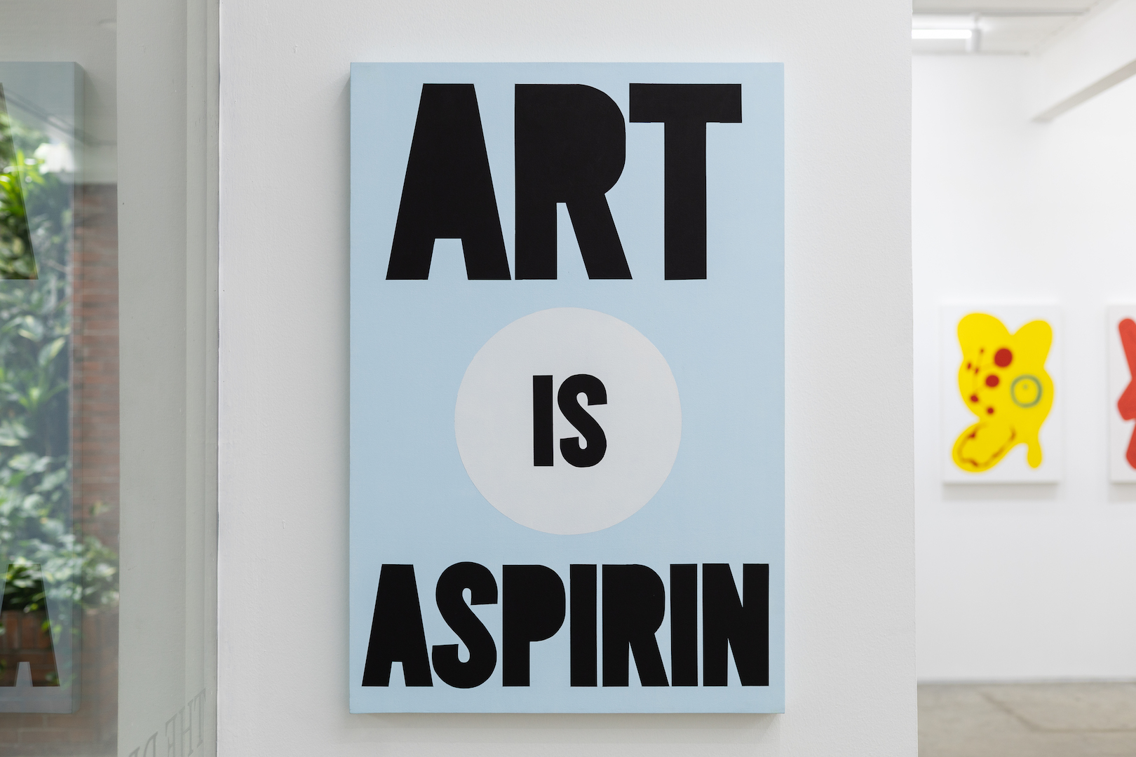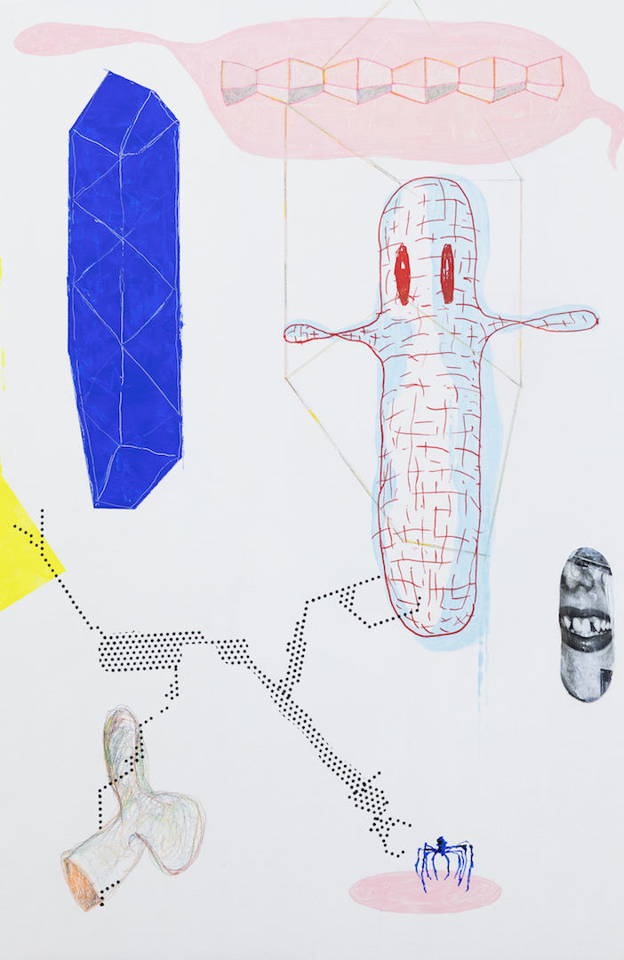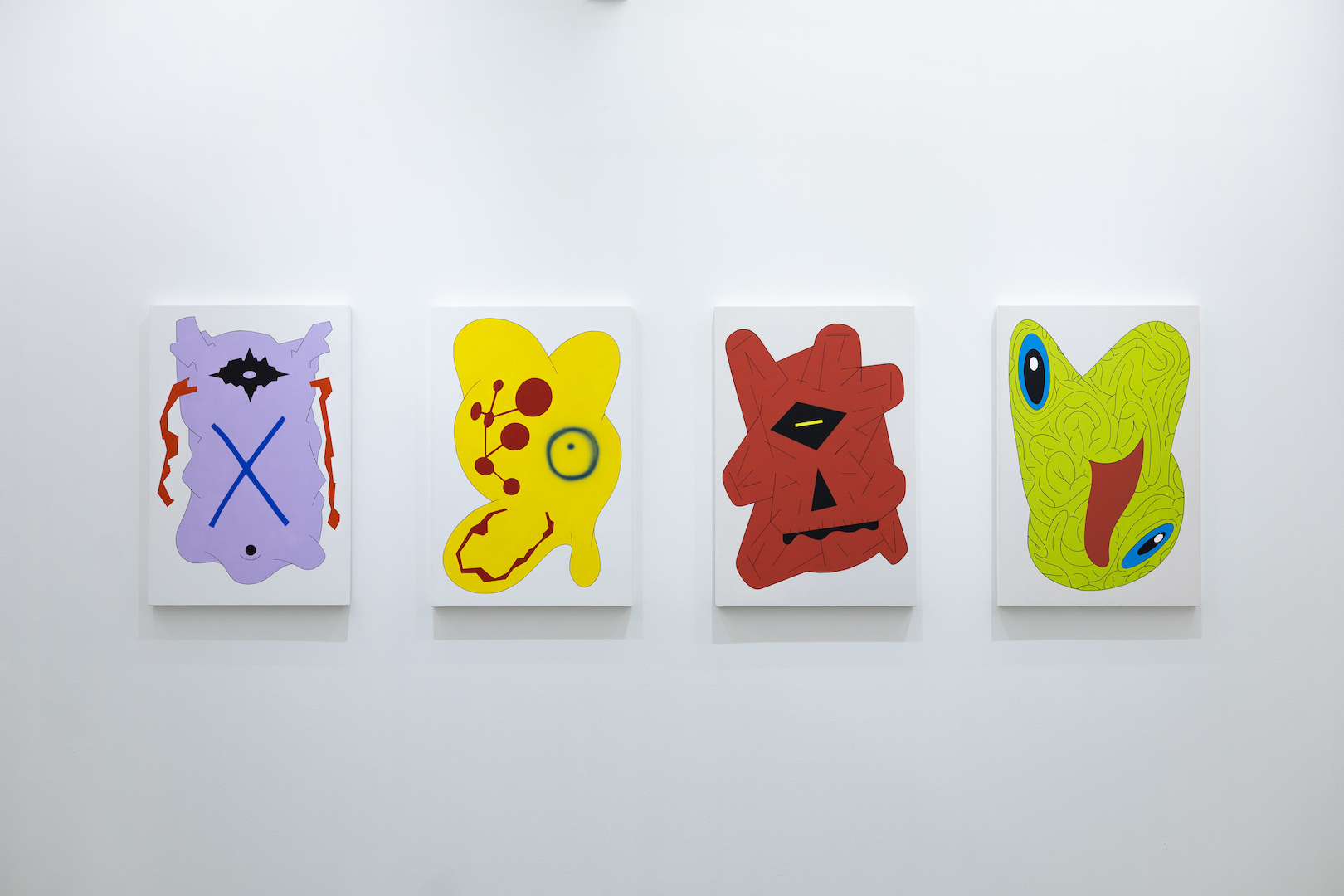 Exit Right After Pluto is an invite to a far off corner of an imagined planet, populated by off world beings. Clad in ice cream colors and awash in flat light, they are delicious denizens of a carnival. No delineated perspective exist nor any determinable light source, it is a stripped down world where flatness reigns. Flatness makes modern art go round and round.